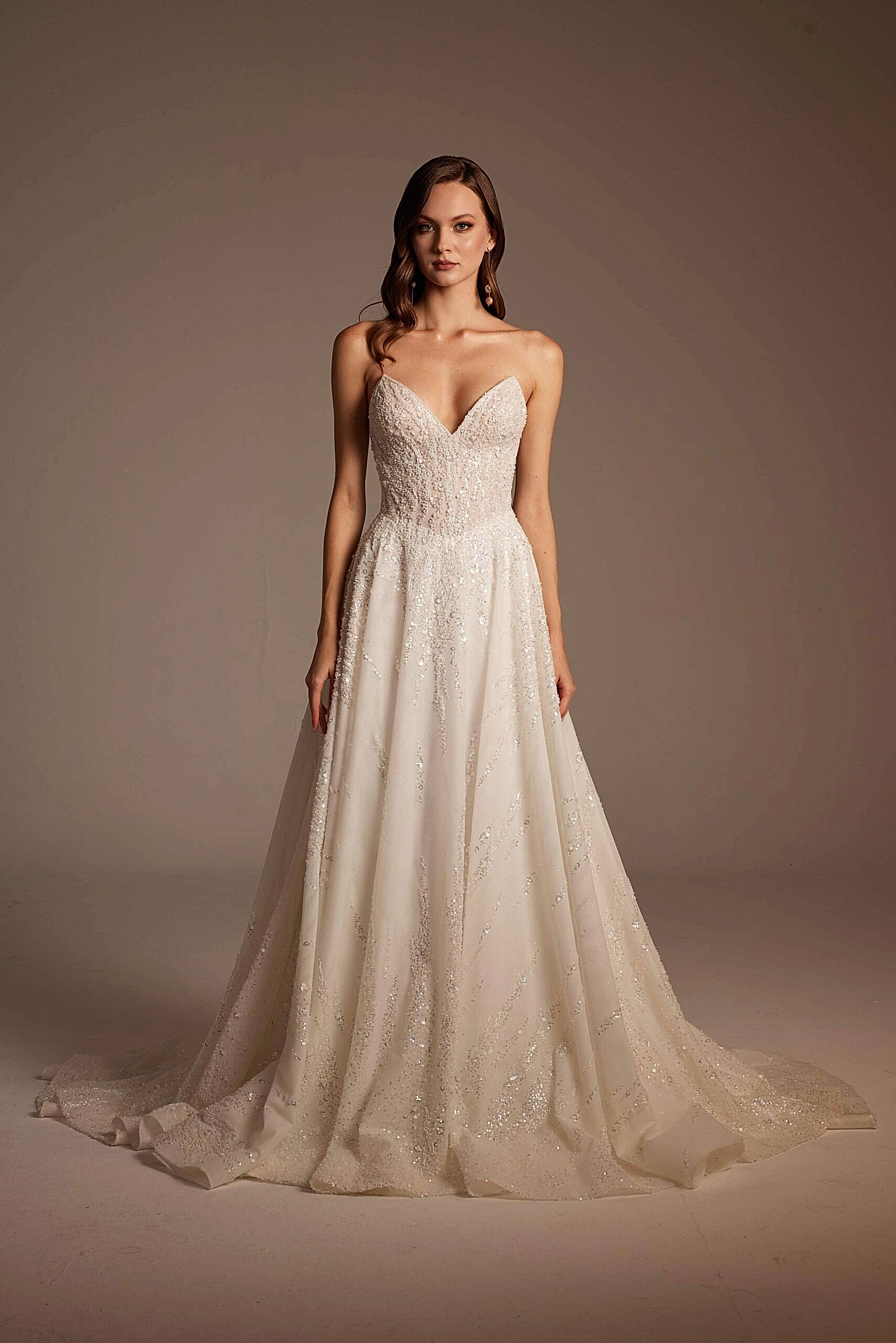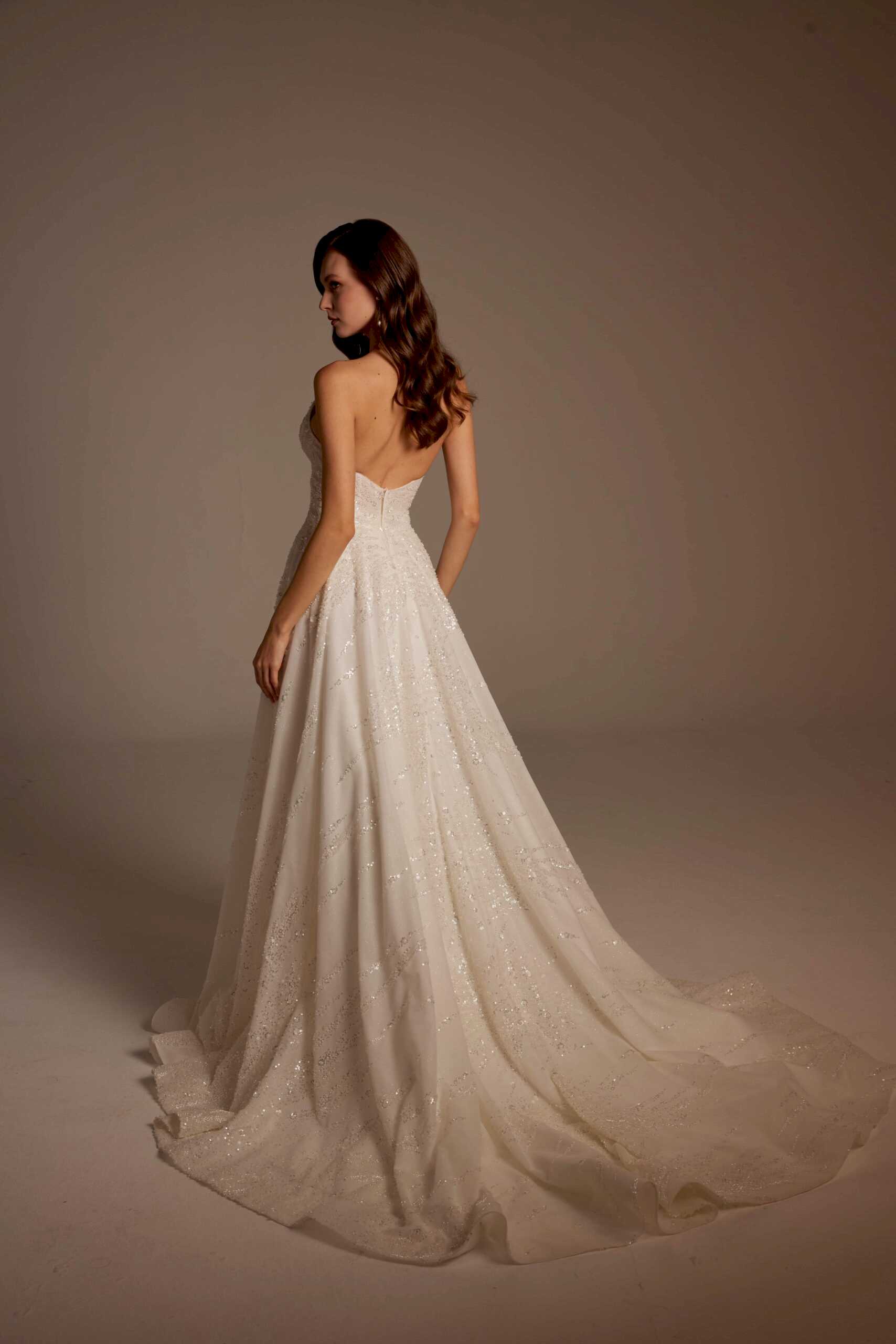 Arka tasarımda sade ve açık sırt formu tercih edilmiştir. Bu detay, gelinliğin ışıltılı ön yüzünü dengelerken modern bir şıklık yaratır. Uzun ve akışkan eteği, yürüyüş sırasında doğal bir hareket sağlayarak sahnede etkileyici bir görünüm sunar.