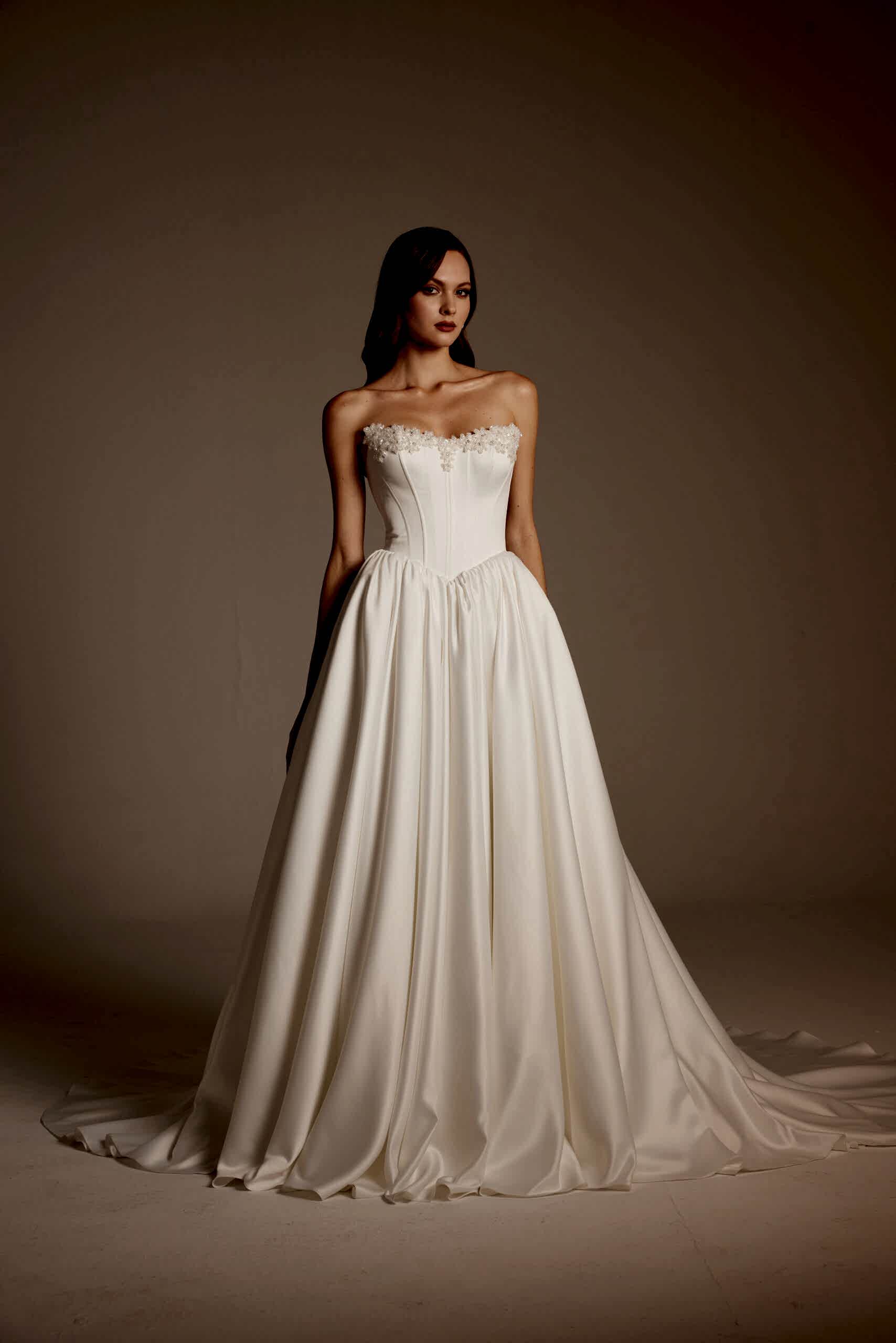 İstanbul gelinlik modasında öne çıkan bu tasarım, nikâh, kır düğünü ya da şık salon düğünleri için rahatlıkla tercih edilebilecek zamansız bir modeldir. 2026 gelinlik modelleri arasında sadeliğiyle fark yaratmak isteyen gelinler için güçlü bir alternatiftir.