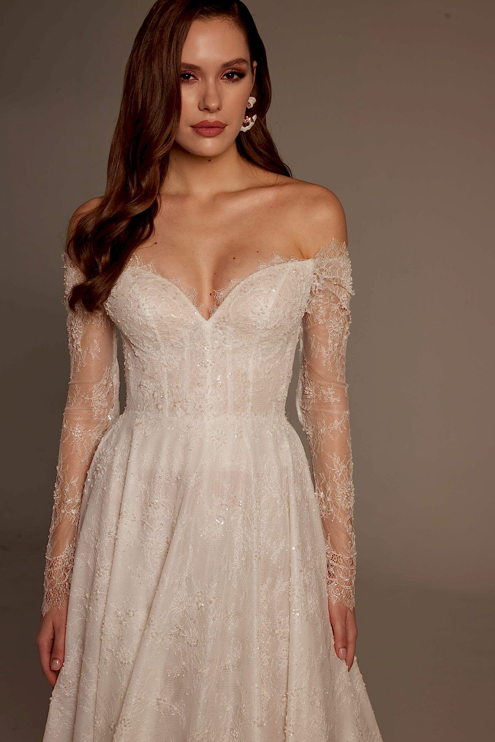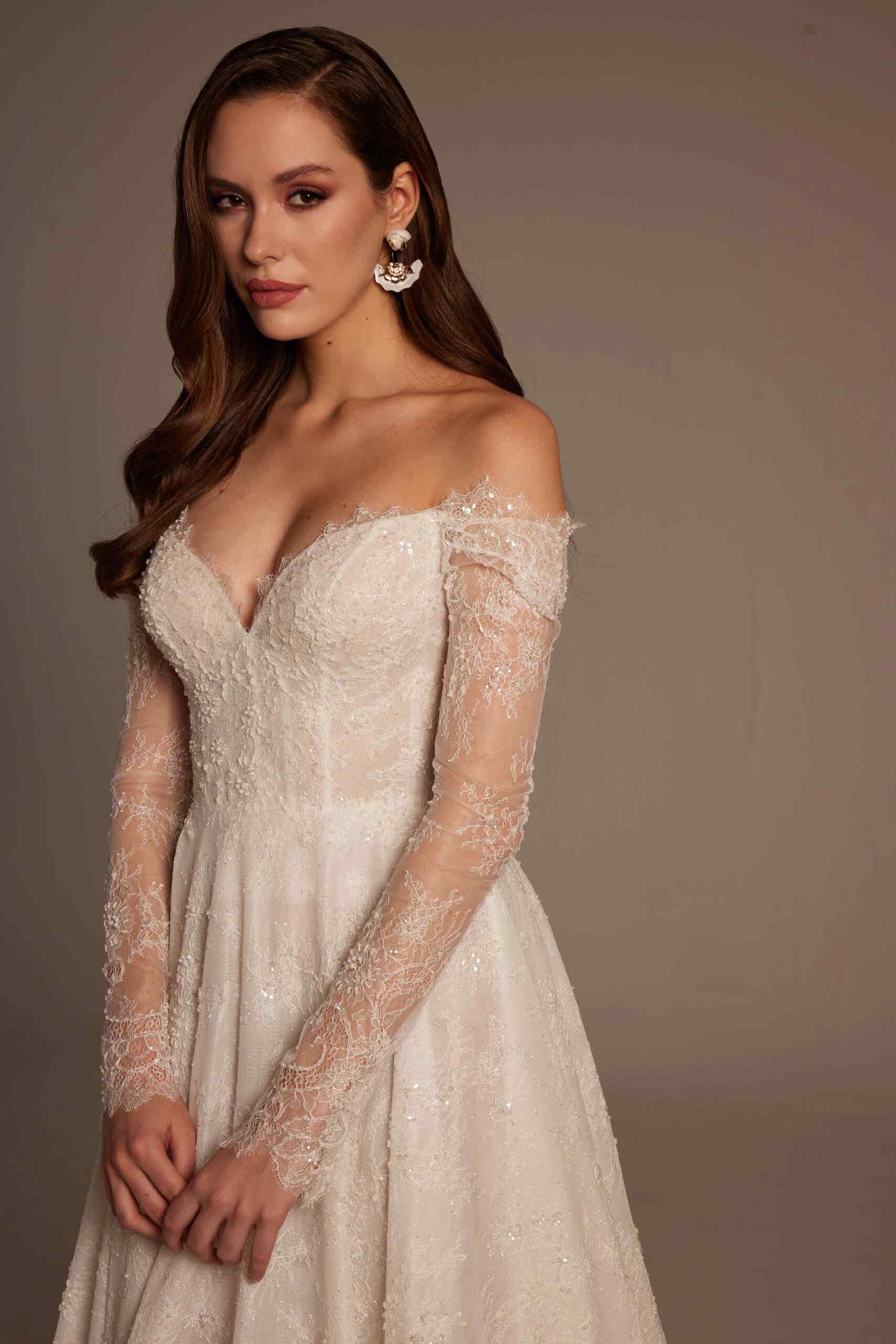 Merve Model, Nurcan Ege 2026 Gelinlik Koleksiyonu’nun romantik zarafeti sofistike detaylarla buluşturan özel tasarımlarından biridir. Omuzdan düşen transparan dantel kollar, gelinliğe yumuşak ve feminen bir ifade kazandırırken; derin V yaka formu dekolte hattını zarif ve dengeli bir şekilde öne çıkarır.