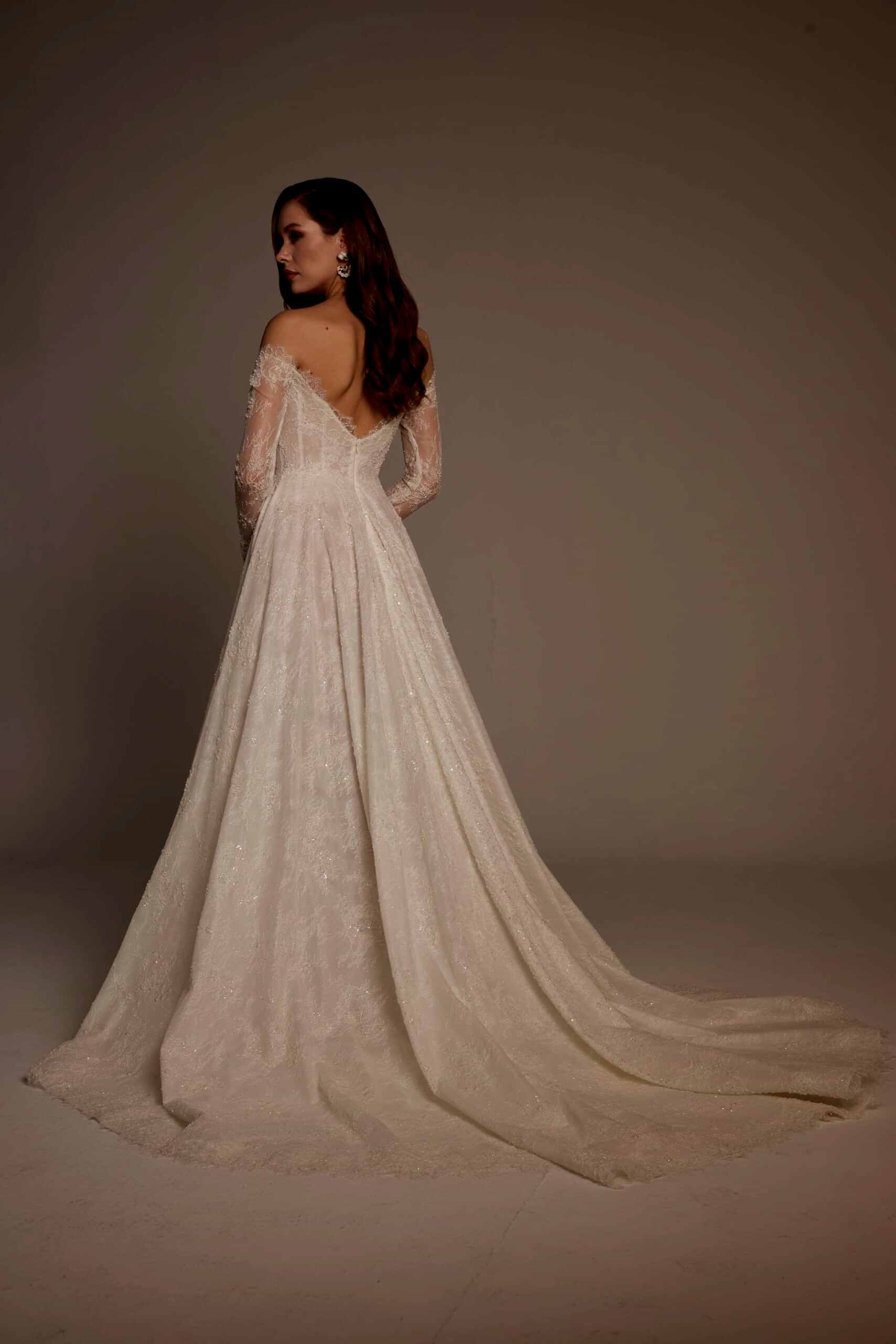 Arka tasarımda açık sırt detayı ve zarif korsaj yapısı dikkat çeker. Bu detaylar, Merve Model’e klasik gelinlik zarafetini korurken modern bir dokunuş kazandırır. Uzun etek ve hafif kuyruk formu, gelinliğin asil duruşunu tamamlar.