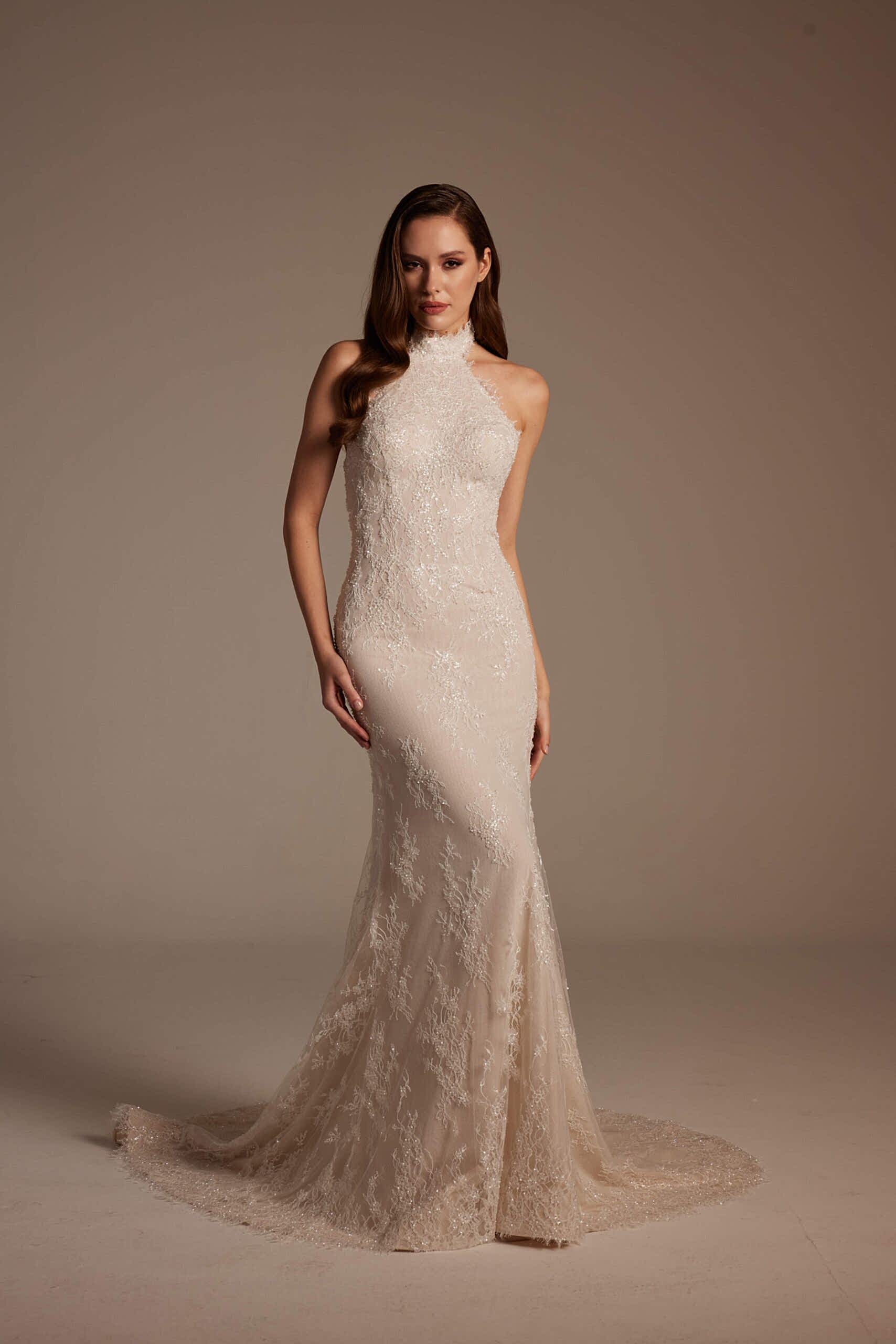 Boyundan bağlamalı yüksek yaka formu, gelinliğe asil ve modern bir karakter kazandırırken; sırt dekoltesi tasarıma cesur ama zarif bir denge katar. Baştan sona dantel işlemelerle kaplı yapısı, ışık altında yumuşak bir ışıltı sunarak gelinliğe derinlik ve hareket kazandırır. Balık kesime yakın formu sayesinde vücut hatlarını zarif şekilde ortaya çıkarır ve kuyruğa doğru akıcı bir geçiş sağlar.