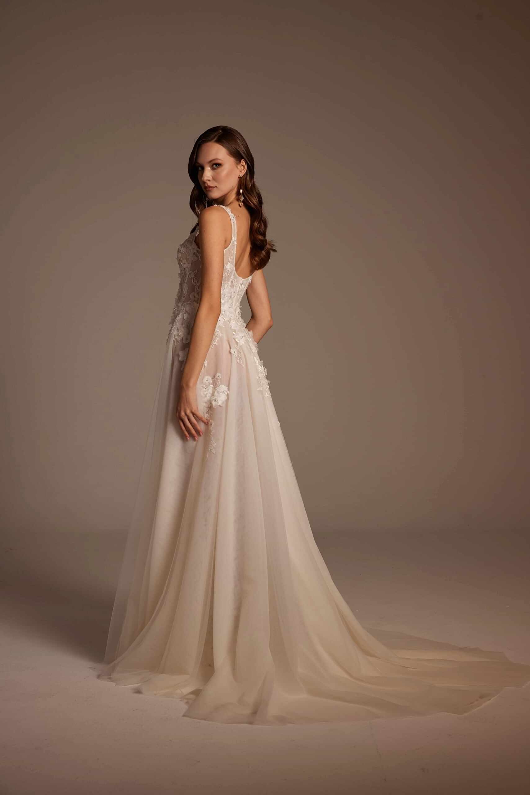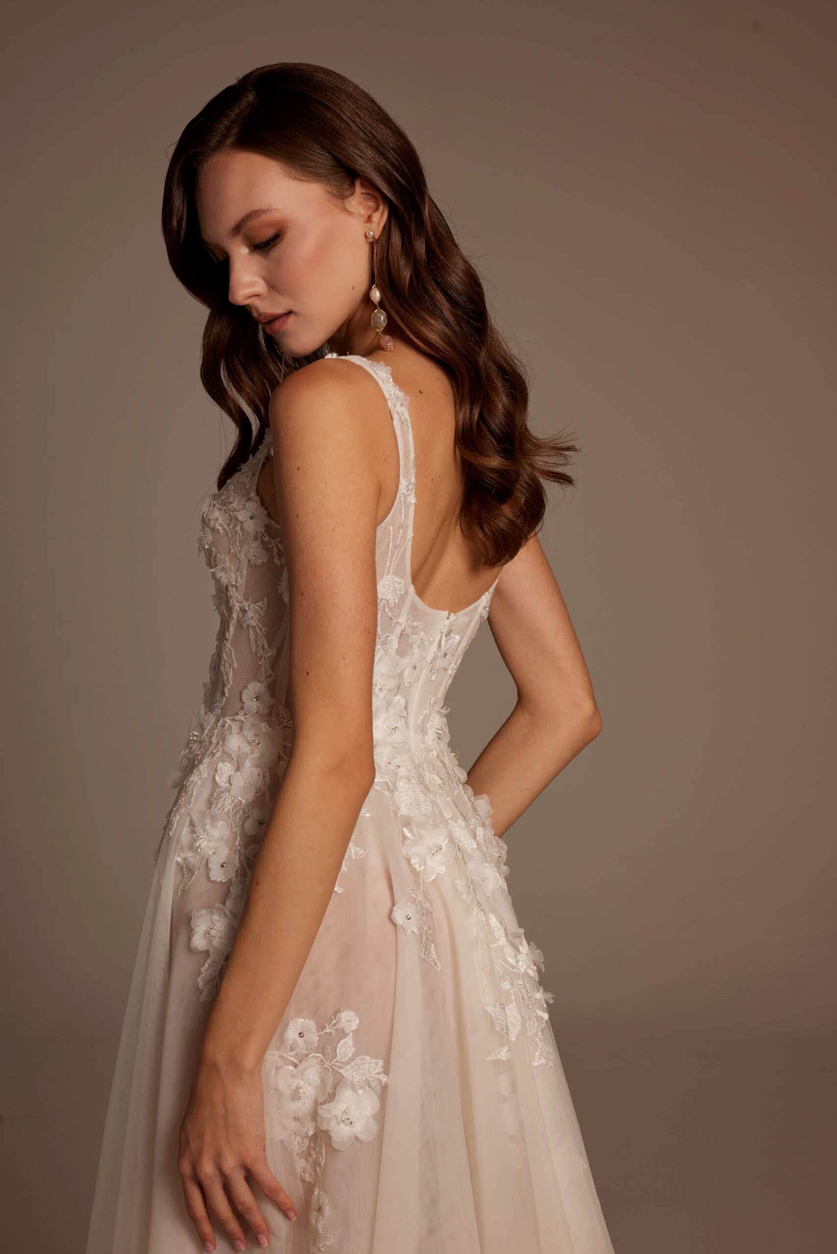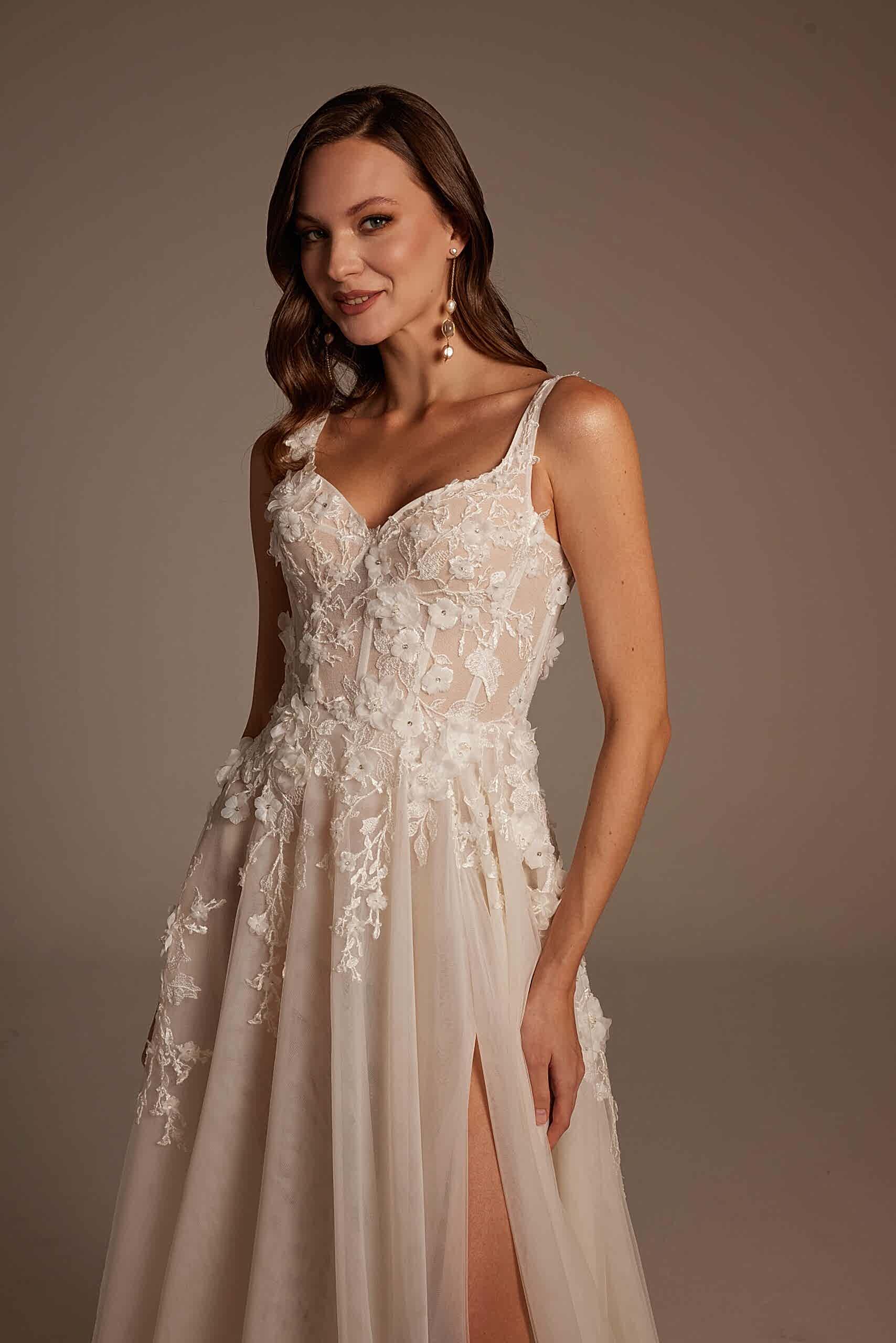 Roza Model, romantik detaylarla modern çizgileri bir araya getiren özel bir gelinlik tasarımıdır. İnce askılı ve transparan dokulu korsajı, vücudu zarif şekilde sararken el işçiliği dantel aplikeleri gelinliğe sofistike bir görünüm kazandırır. Derin yırtmaç detayıyla hareketlenen etek yapısı, hafif ve akışkan tül formuyla gün boyu konfor sunar. Arka görünümdeki zarif sırt kesimi ve doğal dökümlü etek, Roza Model’i hem sade hem iddialı bir tercih haline getirir.