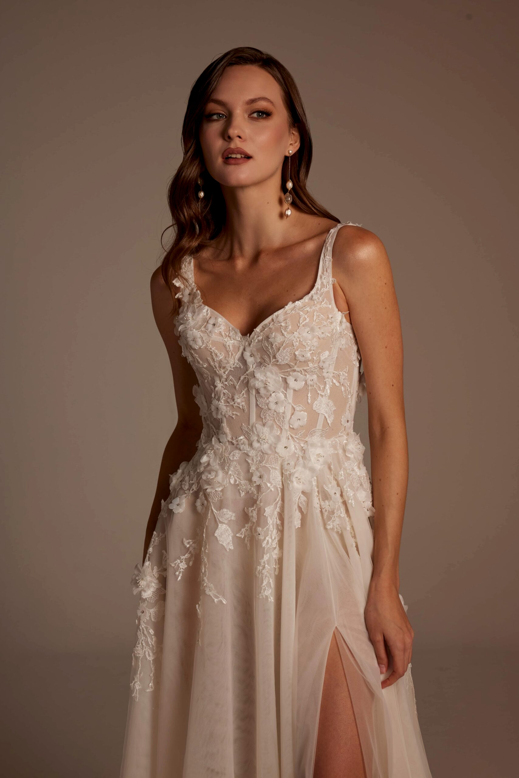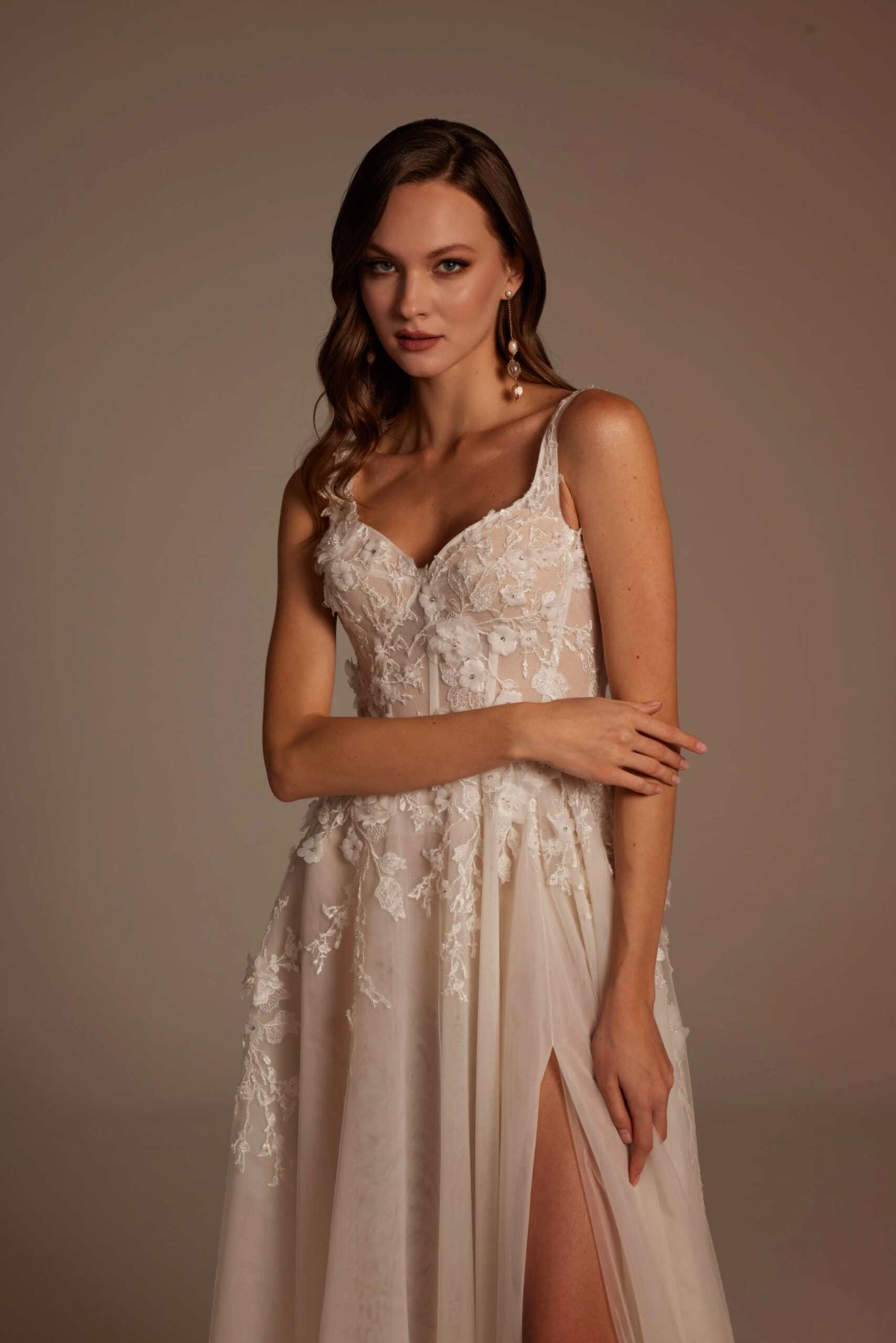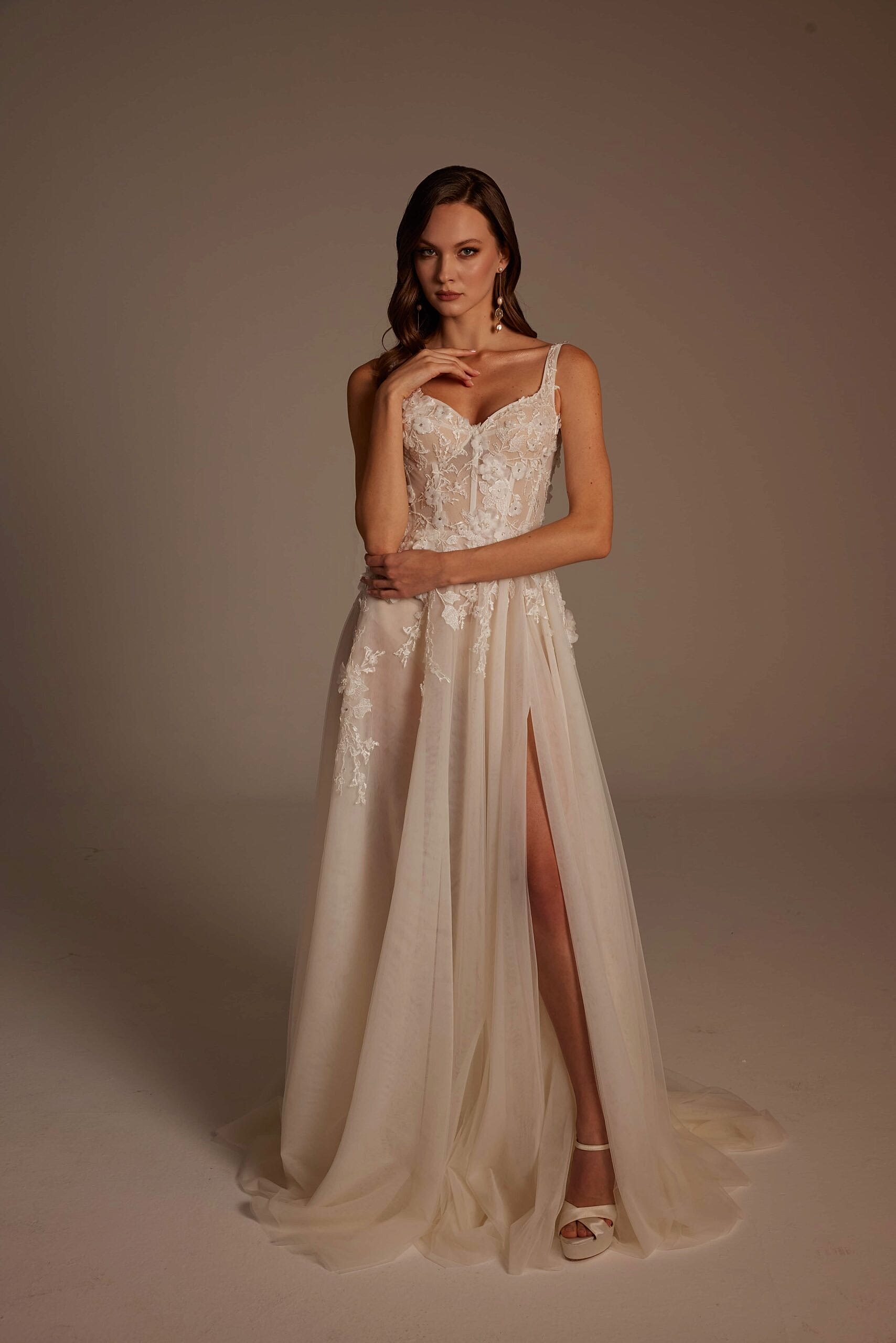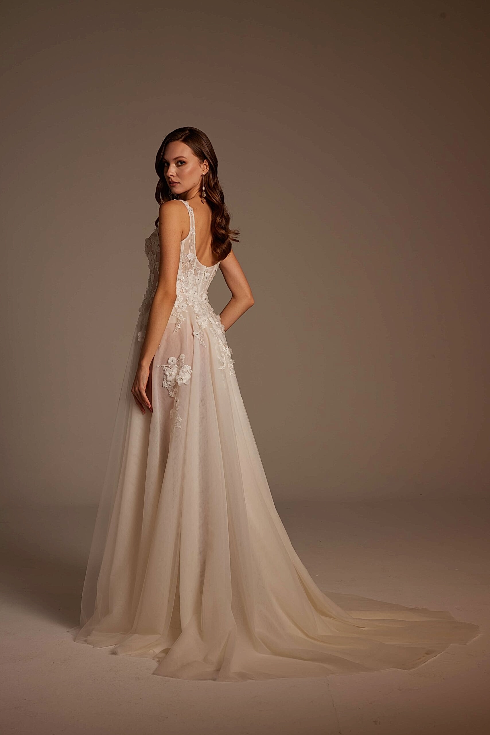 Roza Model, romantik detaylarla modern çizgileri bir araya getiren özel bir gelinlik tasarımıdır. İnce askılı ve transparan dokulu korsajı, vücudu zarif şekilde sararken el işçiliği dantel aplikeleri gelinliğe sofistike bir görünüm kazandırır. Derin yırtmaç detayıyla hareketlenen etek yapısı, hafif ve akışkan tül formuyla gün boyu konfor sunar. Arka görünümdeki zarif sırt kesimi ve doğal dökümlü etek, Roza Model’i hem sade hem iddialı bir tercih haline getirir.