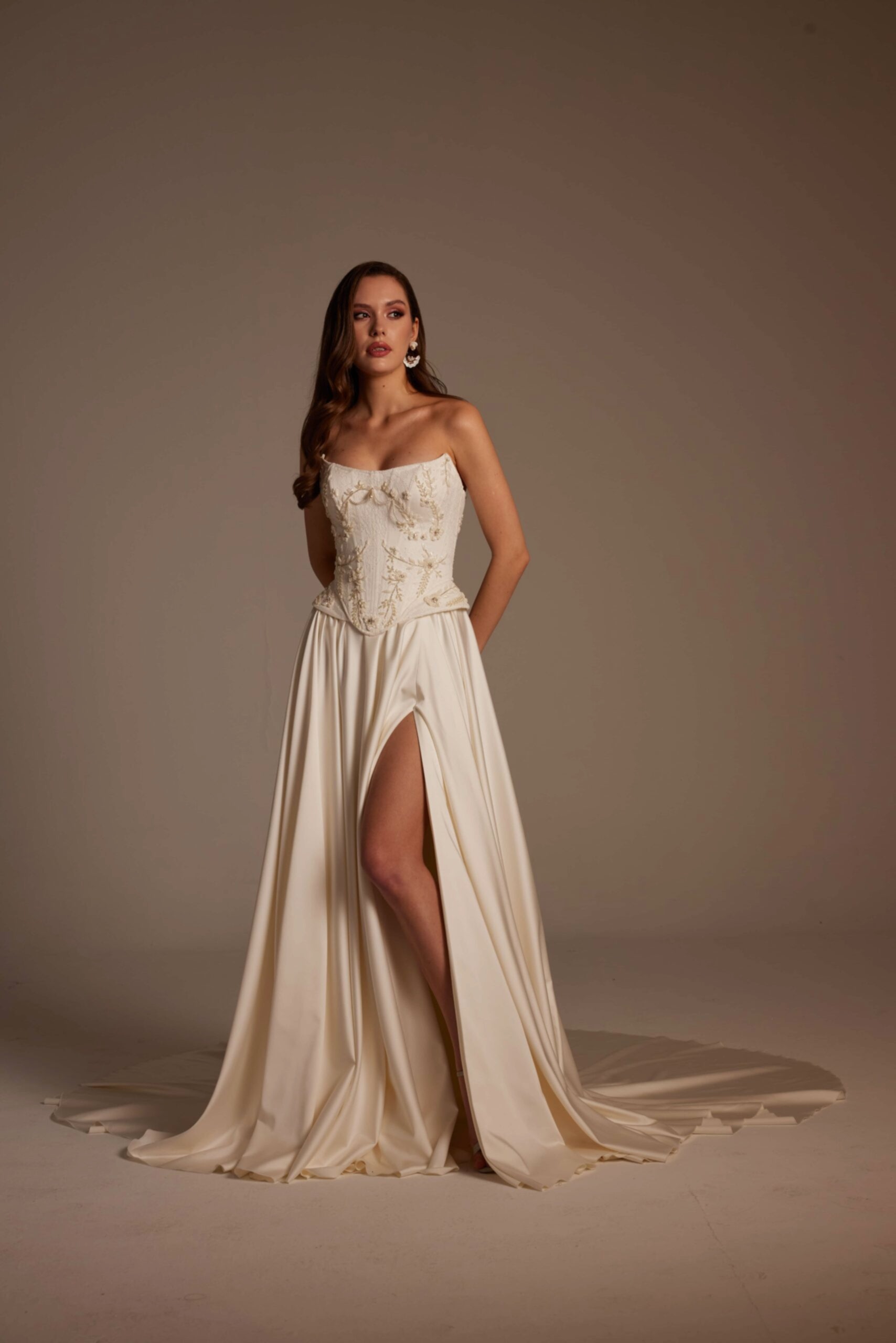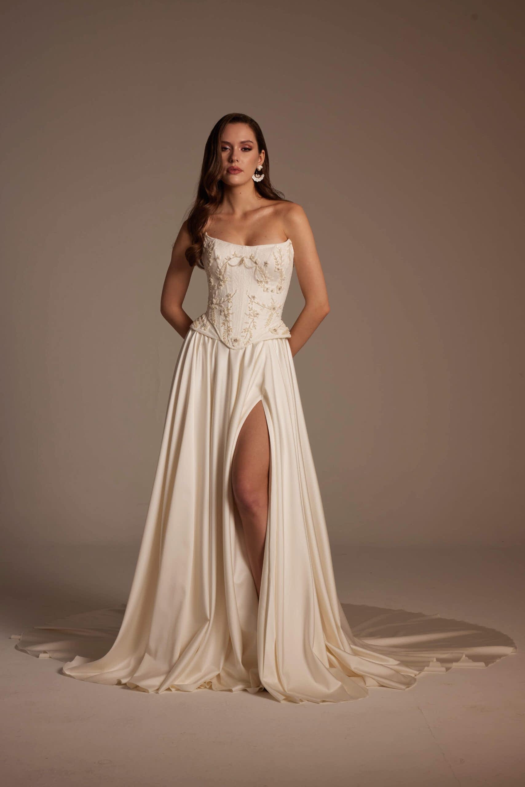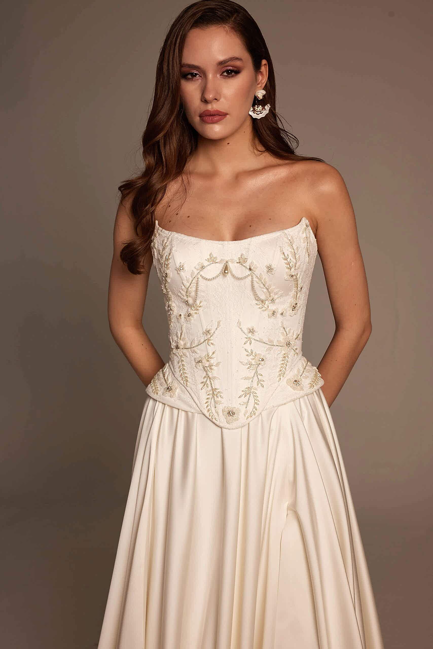 Korse formundaki üst beden, bel hattını net bir şekilde vurgulayarak feminen bir duruş sağlar. İşlemelerin doğal geçişleri, gelinliğin üst kısmında zarif bir hareket oluştururken eteğe doğru sadeleşen yapı, tasarıma dengeli ve modern bir görünüm kazandırır. Ön kısımda yer alan yırtmaç detayı ise Selin Model’i klasik gelinliklerden ayırarak cesur ve şehirli bir stil sunar.