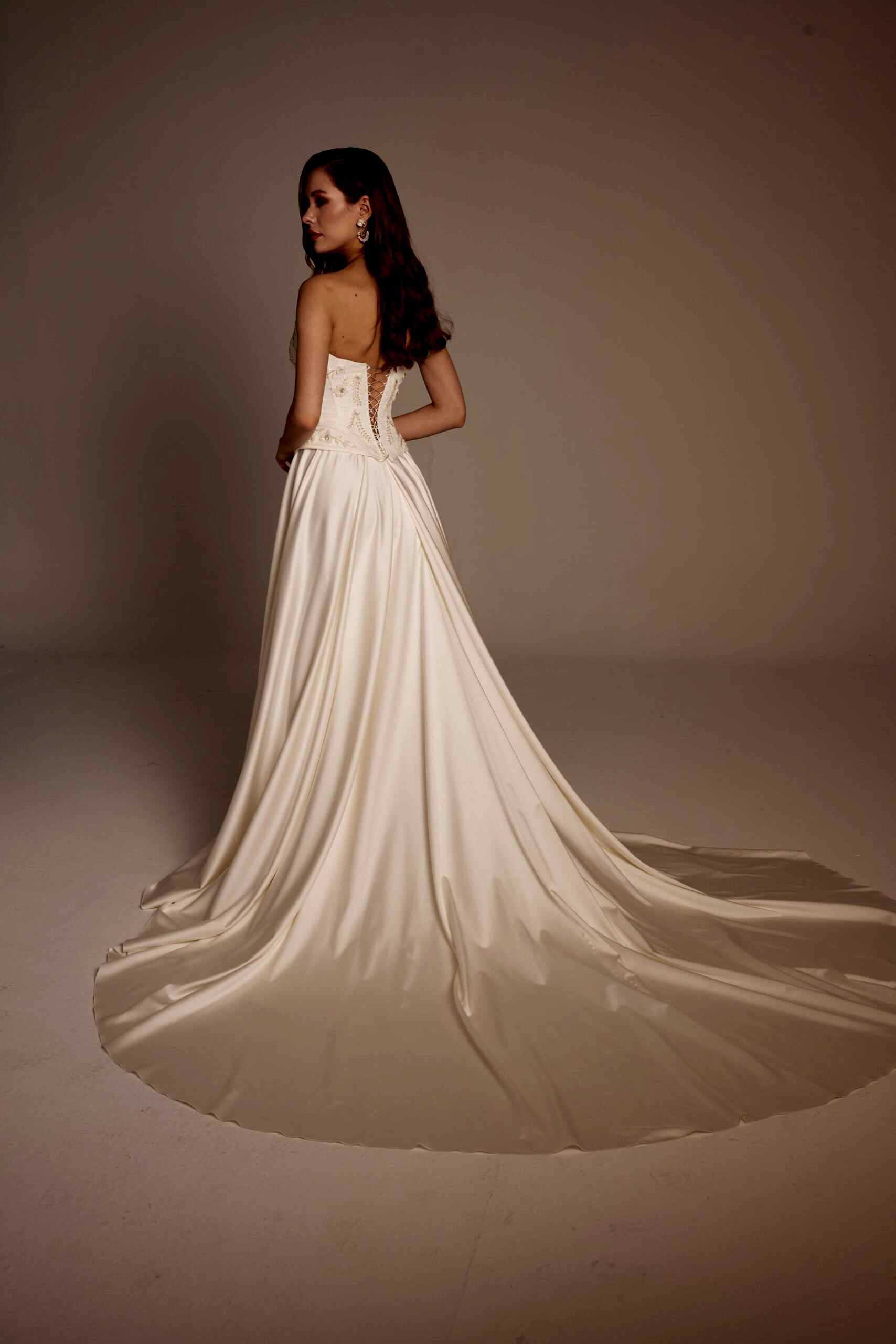 Arka tasarımda yer alan bağcıklı korsaj detayı, hem estetik hem de vücuda uyumlu bir yapı sağlar. Uzun ve akışkan etek, yürüyüş sırasında doğal bir hareket sunarak gelinliğin zarafetini ön plana çıkarır. Selin Model, rahatlığı ve şıklığı bir arada arayan gelinler için ideal bir seçenektir.