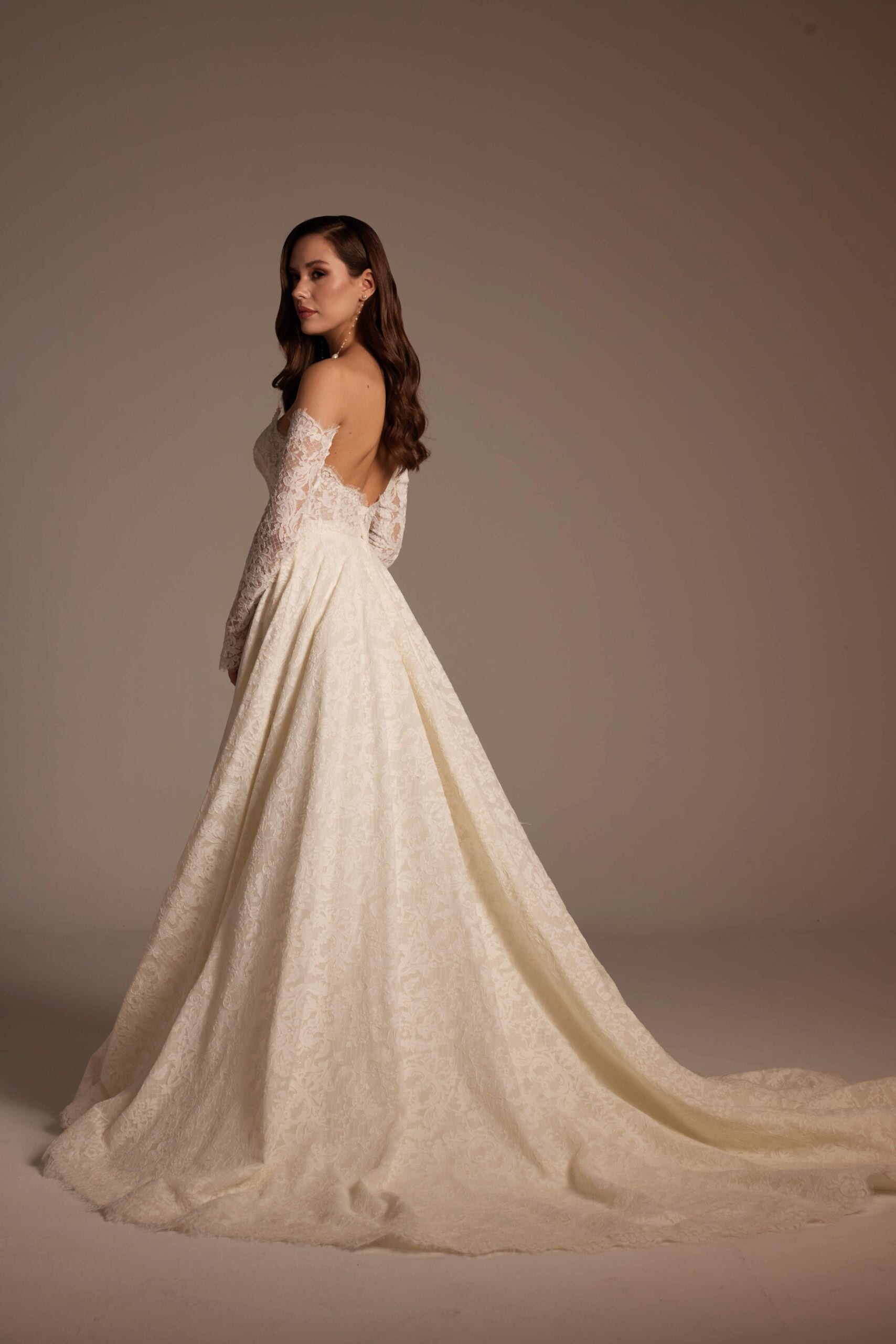 Arka tasarımda açık sırt formu ve zarif dantel geçişleri yer alır. Uzun ve akışkan etek yapısı, yürüyüş sırasında doğal bir hareket sağlarken gelinliğin asil duruşunu tamamlar. Vera Model, klasik gelinlik anlayışını modern detaylarla yeniden yorumlayan güçlü bir tasarımdır.