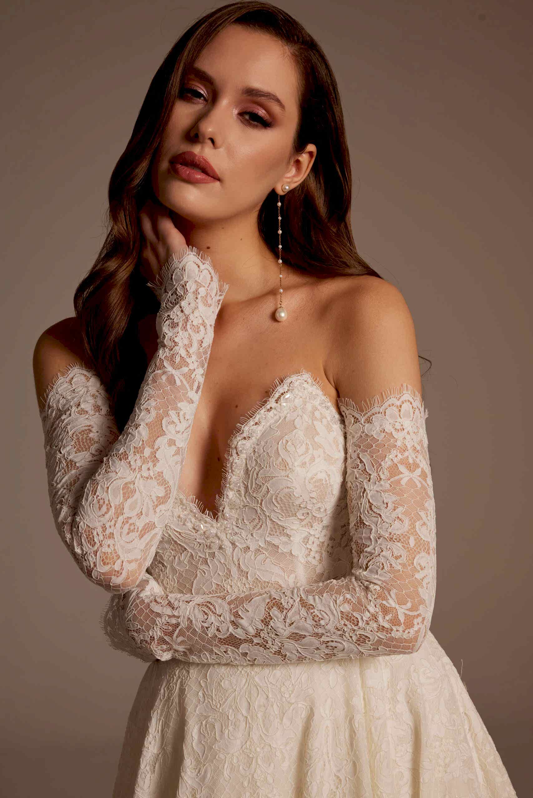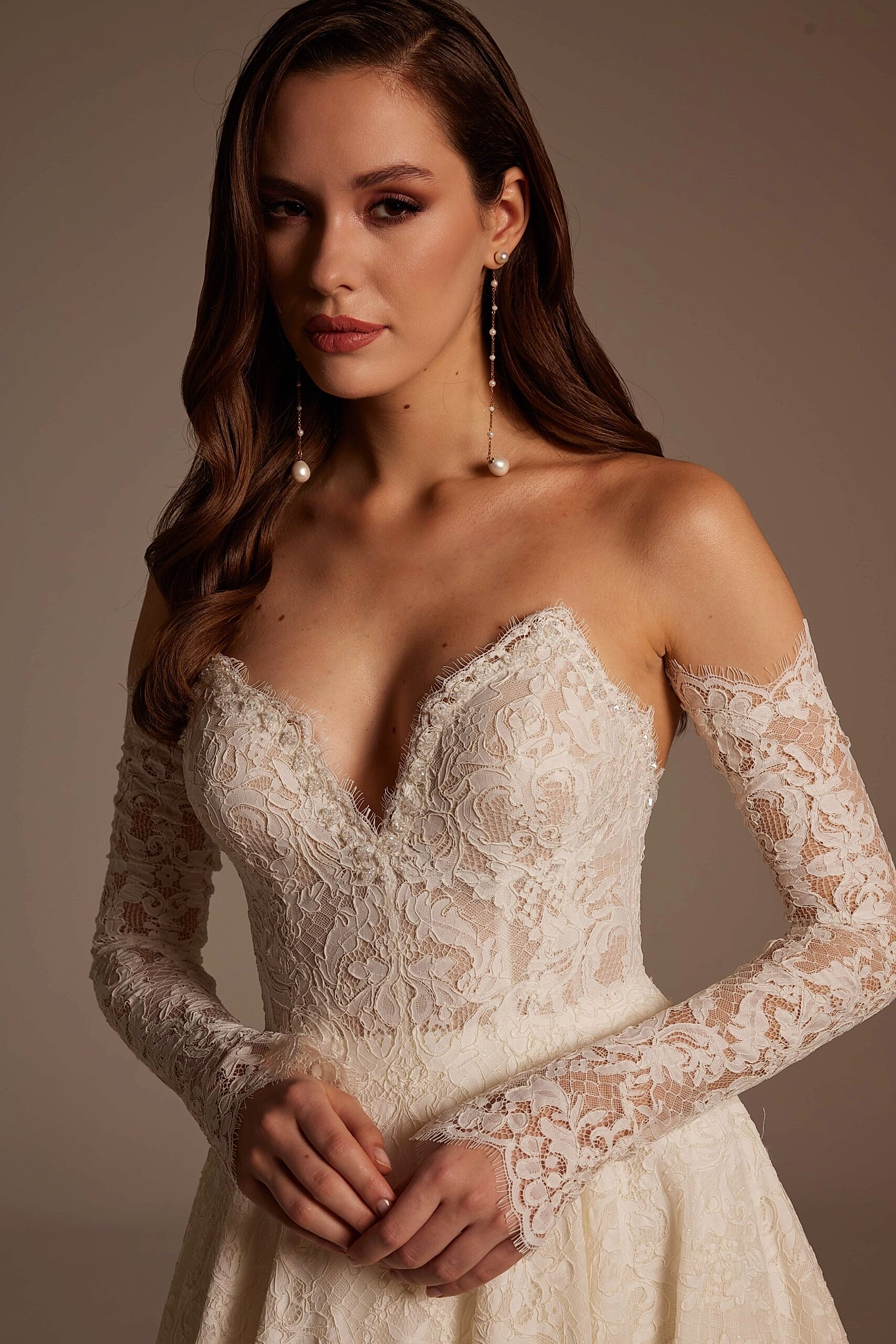 Vera Model, Nurcan Ege 2026 Gelinlik Koleksiyonu’nun zamansız dantel zarafetini güçlü ve feminen bir siluetle birleştiren özel tasarımlarından biridir. Omuzdan düşen dantel kollar ve derin V yaka formu, dekolte hattını zarif bir şekilde vurgularken gelinliğe romantik ve sofistike bir karakter kazandırır.